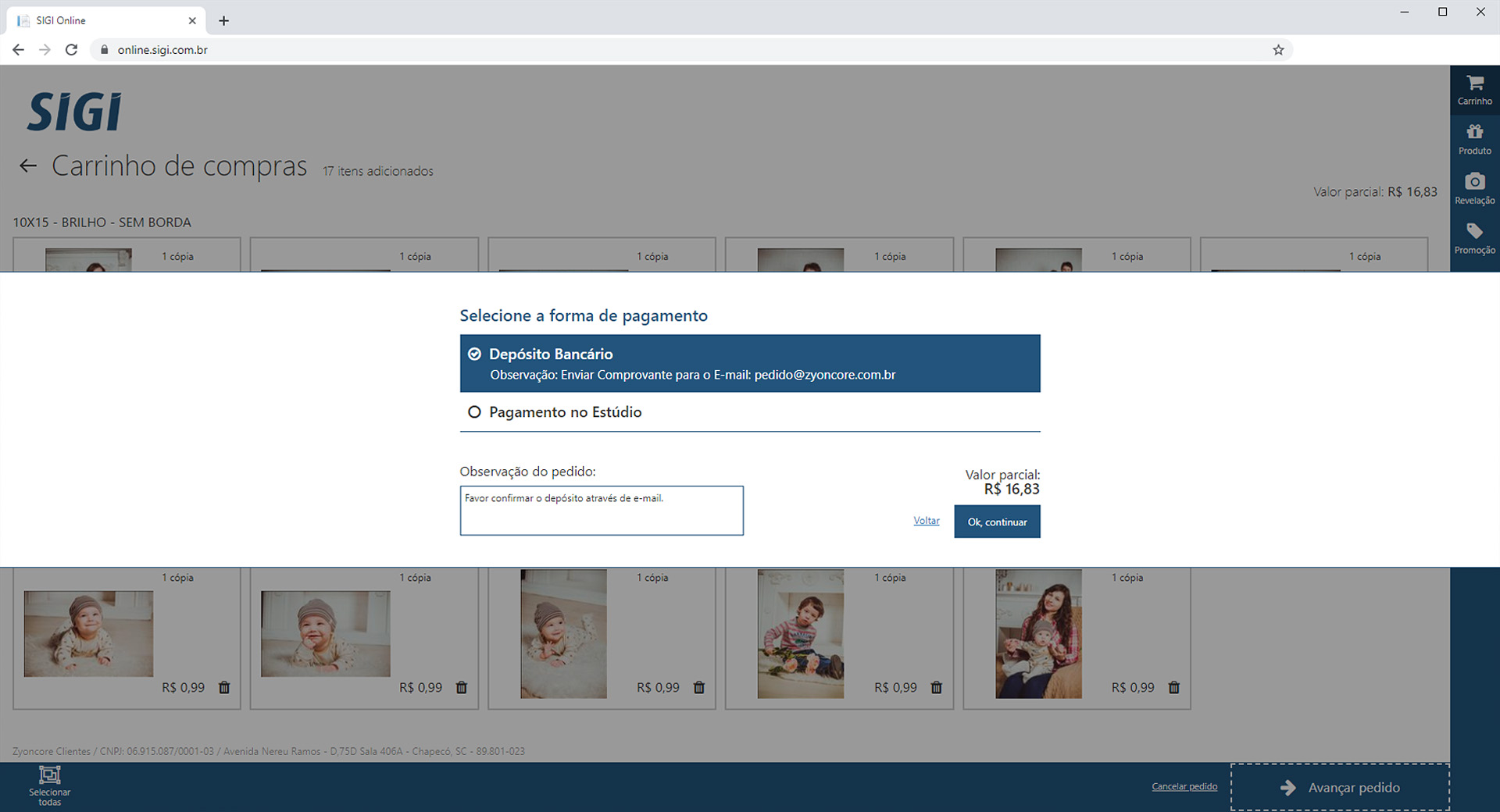 O sistema SIGI ON-LINE é um software para o envio de imagens digitais pelo site para revelação / Impressão.
